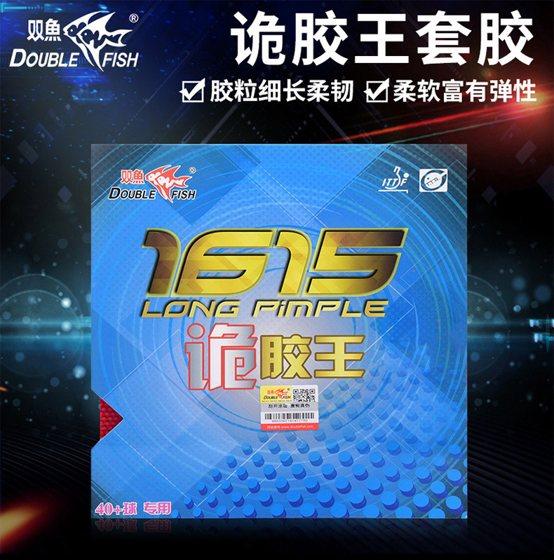 簡介:1615詭膠王是1615長膠系列中以「詭」為特色的長膠。膠皮質薄,厚度均勻。膠粒細長柔韌,柔軟且富彈性;膠粒頂部印有獨特紋路,回球時能增加膠粒頂部與球面的摩擦力,增強反旋轉能力。細長柔軟的設計,可以讓膠粒與球接觸時形成不規則的形變,從而產生不同方向的反作用力使球劇烈晃動,形成無序飄忽的出球路線。